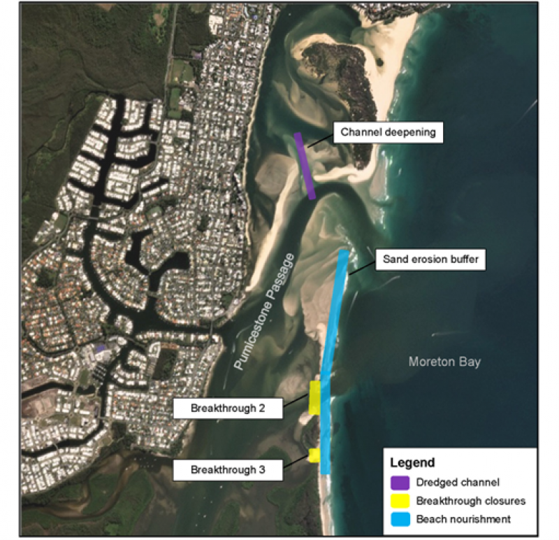 - renourishing and buffering the Bribie Island segment between the breakthroughs and the tidal entrance to Pumicestone Passage